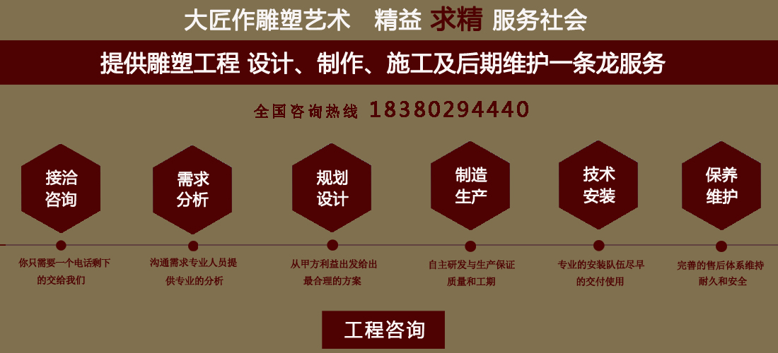 成都大匠作雕塑有限公司,是經(jīng)成都工商局審定注冊的正規(guī)專業(yè)雕塑制作及工程安裝服務(wù)機(jī)構(gòu),是由一群年輕富有朝氣的年輕人創(chuàng)辦,發(fā)軔于四川省成都市龍泉驛區(qū)。它是一家******于創(chuàng)作、制作和銷售為一體的公司。大匠作擁有多年從事公共藝術(shù)的專業(yè)人員和雕塑制作人組成的核心團(tuán)隊(duì),為您提供專業(yè)、具創(chuàng)新的設(shè)計(jì)及制作服務(wù)。公司成立以來,秉承“******服務(wù)、誠信為本”的宗旨,以客戶需求為目標(biāo)導(dǎo)向,不斷學(xué)習(xí),進(jìn)取,優(yōu)化和提高服務(wù)質(zhì)量,公司向您******——“您的滿意***是我們的信譽(yù)”,我們將以飽滿的熱情和******的服務(wù)贏得您的贊譽(yù)和支持。